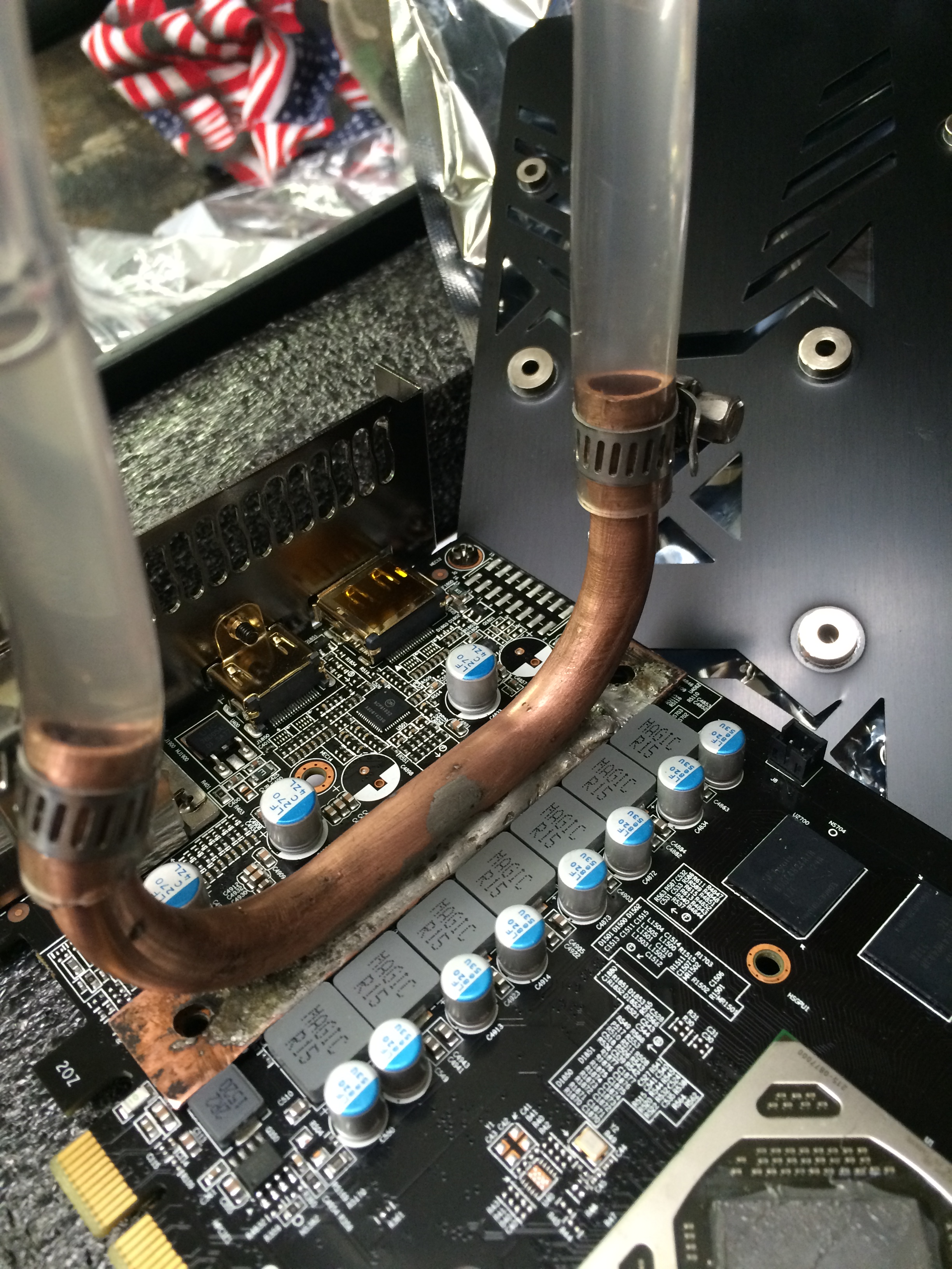 This is a small waterblock I made, out of copper, for my computer’s graphics card. The copper pipe goes over the power circuitry, and the main block goes over the die. I’m not going to lie, soldering my first time, copper pipe. I had to get the hang of it, but hey. It didn’t leak.